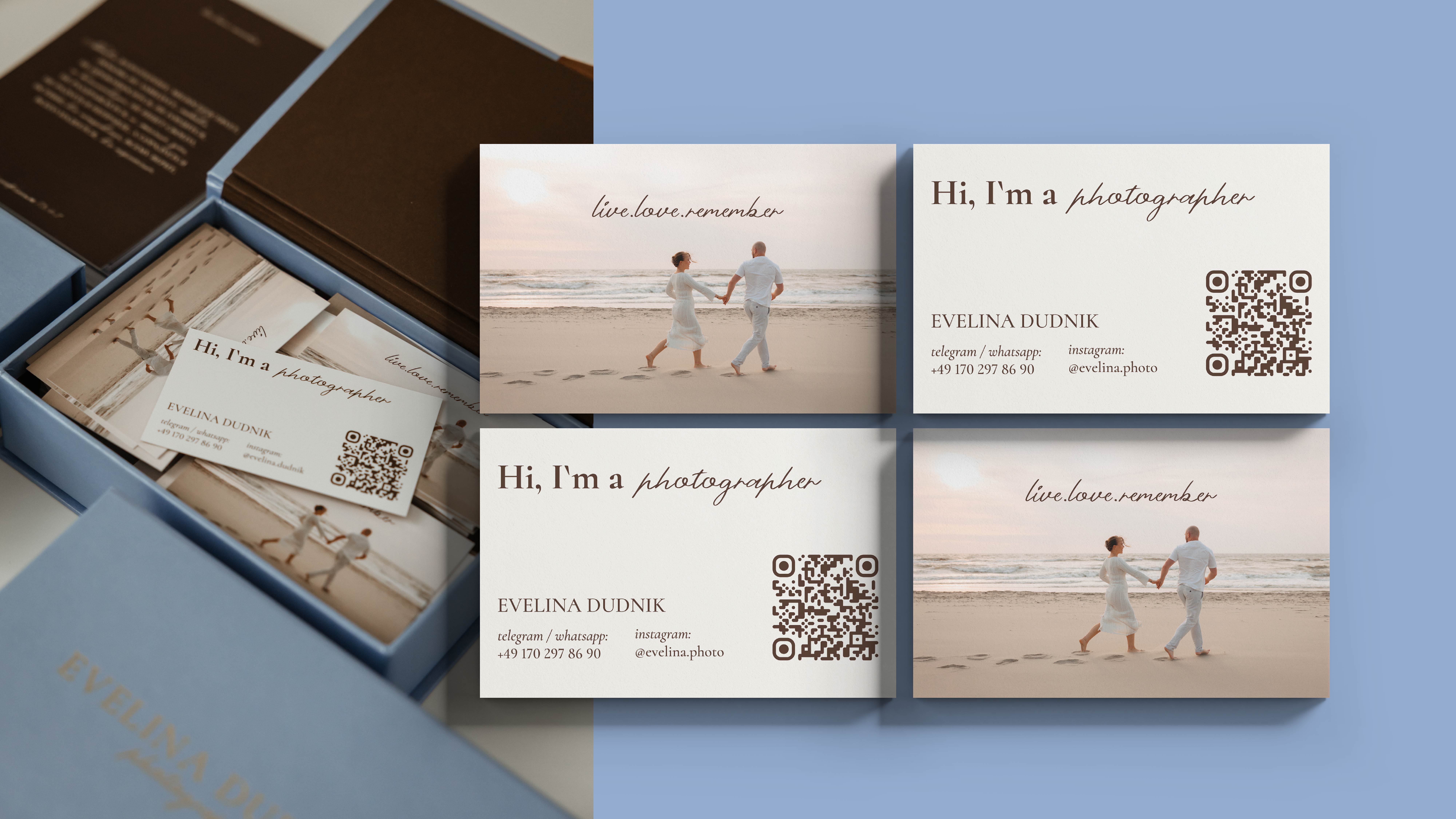 logo and visual identity for a photographer. Designing business cards and postcards.